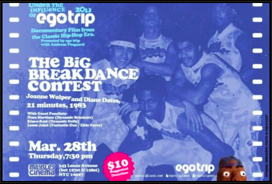 I was so happy to be a on the guest panel yesterday at the showing of the Big Break Dance Contest at the Mayles Cinema on Lenox Ave and 127th St. So good to be recognized for my paticipation in that event of over 600 contesting bboy, bgirls, and electric boogie poppers. As one of the members of The Fantastic Duo where we won 2nd prize in the finals, I was able to represent my crew there. I am grateful for this opportunity and wish that the other half of The Fantastic Duo Robert Steele was there to enjoy this moment. It’s been 30 years and because of my experience at that event, I am sure that it has a lot to do with my continuation in the dance scene for all of these years. I am totally blessed to have the career that I have. I want to thank all of the crews that I have been apart of all of for most of my life from the beginning: The Float Committee, The Fantastic Duo, The Rhythm Technicians, Mop Top, and Elite Force.